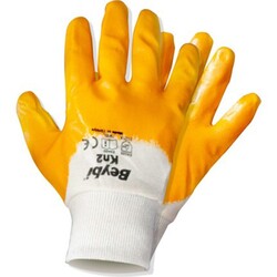 Yüksek Performanslı 3/4 Nitril Kaplı Pamuk Eldiven Tüm endüstri kollarında genel amaçlı işler için, montaj ve mekanik işleri,otomotiv, yükleme, sanayi ve inşaat alanlarında kullanıma uygundur. Örgü bilekliği ve özel kalıbı sayesinde eli daha iyi kavrar ve konforlu kullanım sağlar. Aşınmaya ve yırtılmaya karşı direnç sağlar. Pamuk astarlı dokumaya sahiptir. Sarı renkli nitril kaplıdır. Boy olarak 10 numarası mevcuttur. Eldivenler 3/4 nitril kaplamadır. İç astarı %100 pamuktan dokunmuş kumaştır ve örgü bileklidir. Eldiven Avrupa Yönetmeliği 2016/428 ile uyumludur. ISO 9001:2015 Kalite Yönetim Sistemine uygundur. EN 420:2003 + A1:2009 ile EN 388:2016 + A1:2018 Standartlarına (3121X) uygun olarak üretilmiştir. Mekanik Risklere Karşı koruma